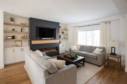 On this project we did a full home renovation on the main level including a modern kitchen and bathroom complete with a beautiful living room with custom built-in cabinetry. This new design merges traditional style with modern and functional elements.